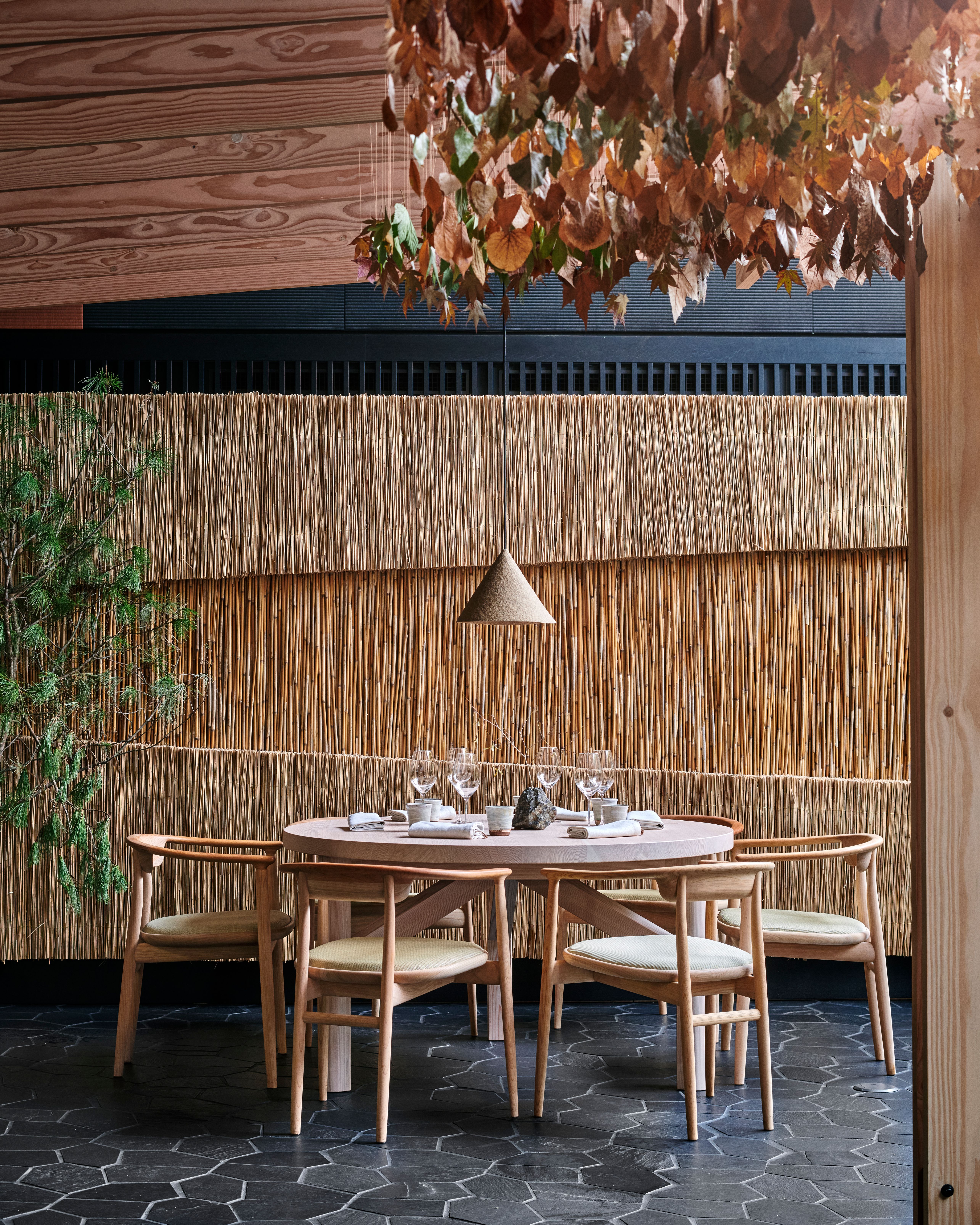 The 250 m2 restaurant space at Ace Hotel Kyoto has been revived again by OEO Studio for Noma, taking on a new direction and embracing the magical autumn of Kyoto and Japan, reminiscent of a forest floor blanketed in golden, burnt, and reddish leaves – relics of the woods.