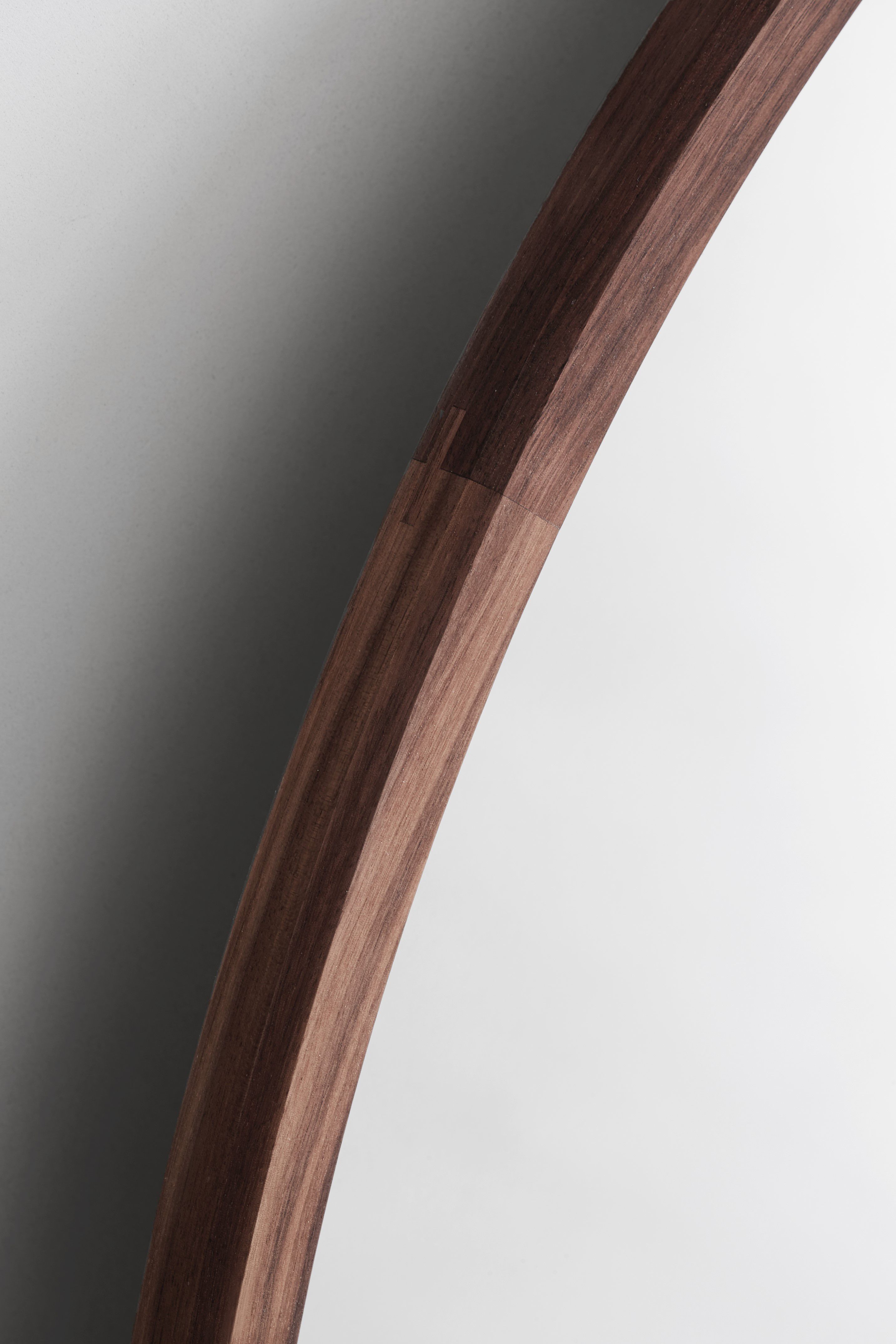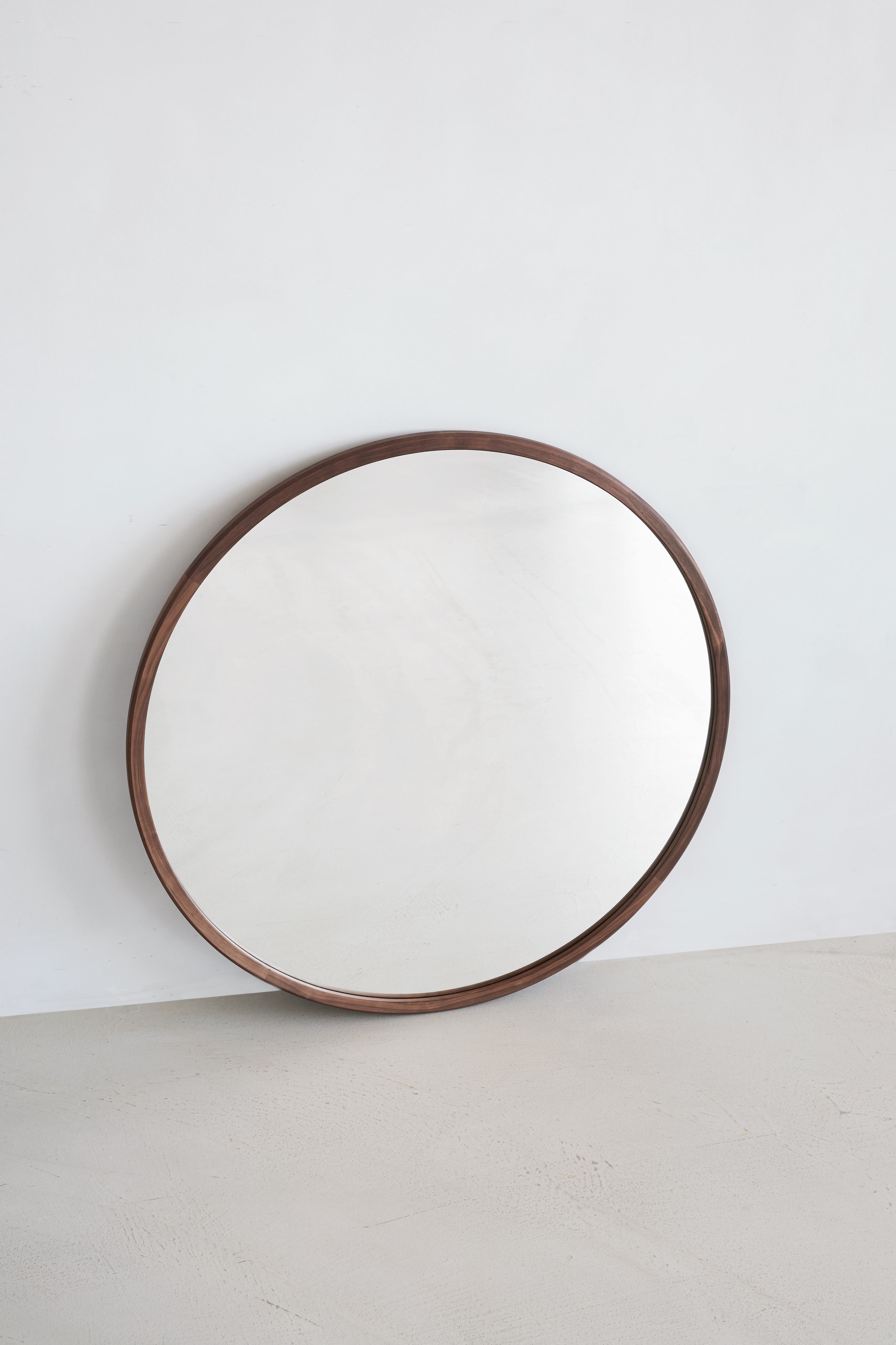 The series consists of three mirrors: square (70x70 cm), rectangular, (70x100 cm), and round (100 cm in diameter ) each with a discrete oiled walnut wooden frame with an ultralow profile.